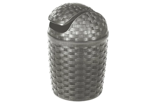 Malý odpadkový koš v šedém provedení je vyroben z plastu. Příjemný ratanový vzor dodá koši netradiční vzhled. Koš s otočným víkem pojme jen 1,2 litru odpadků, a proto je vhodným doplňkem do koupelny nebo na toaletu.