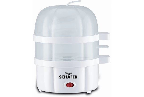 Dvoupatrový vařič vajec značky Schäfer pro uvaření až 14 vajec s možností různých typů tvrdosti. V univerzálním bílém provedení.