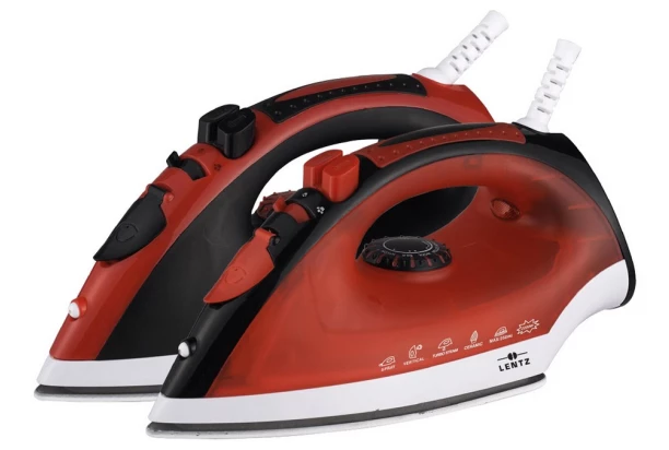 Napařovací žehlička značky Lentz v černo-červeném provedení o příkonu 2300 W s keramickou žehlící plochou a samočistící funkcí.