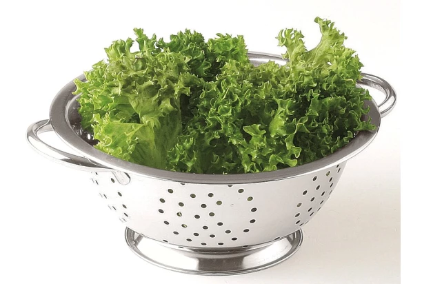Nerezový cedník o průměru 28 cm má praktická madla po stranách a stabilní podstavec.