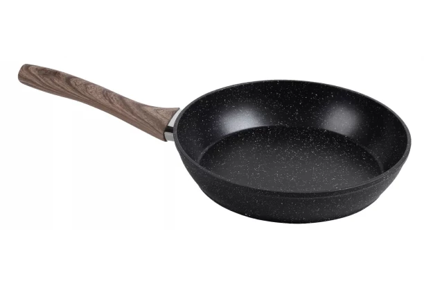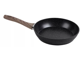 Hliníková pánev v kamenném vzhledu je stylová a také praktická. Oceníte především nepřilnavý povrch, velmi rychlý ohřev a udržení teploty. Plastová rukojeť v imitaci dřeva se pohodlně drží a zajistí snadné vaření. Průměr 20 cm.