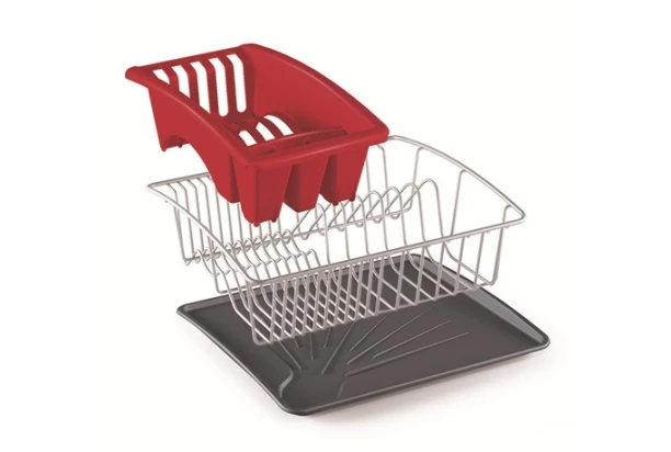 Kuchyňský odkapávač na nádobí má stabilní konstrukci vyrobenou z kovu. Obsahuje navíc plastovou červenou nádobu na příbory, která odděluje drobné příbory od hrnců a talířů. Včetně praktického podnosu pro odkapávání. Rozměr 35×12×32 cm.