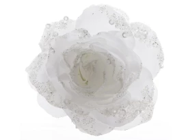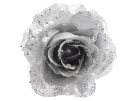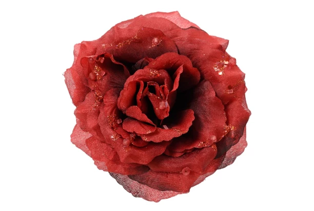 Elegantní květ červené růže se třpytkami je perfektní dekorací do pokoje nebo ozdobou na stromeček či adventní věnec. Díky klipu můžete růži snadno připevnit kamkoliv chcete.