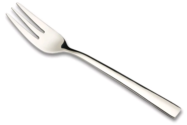 Dezertní vidlička z leštěné nerezové oceli, univerzální pro jakoukoliv jídelnu.