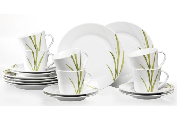 18-dílný kávový servis s jednoduchým přírodním motivem trávy působí harmonicky a zaujme pozornost na jídelním stole. Nádobí je vyrobeno z vysoce kvalitního porcelánu a dokonale zapadne do každé kuchyně. Prostřete stůl a servírujte až pro 6 osob.