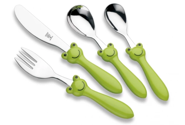 Originální sada dětských příborů obsahuje celkem 4 díly. Tvarované rukojeti s vtipným motivem veselých žabiček se dětem zalíbí a bude jim tak lépe chutnat.