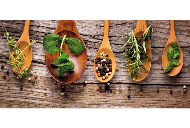 Obraz na zeď o rozměru 70×33 cm s motivem různého koření na vařečkách dokonale ozdobí každou kuchyňskou stěnu.
