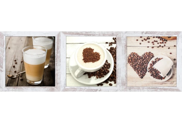 Dekorativní rámovaná sada 3 obrazů na zeď, které vytvoří dokonalý celek vedle sebe nebo nad sebou. Motiv kávy se hodí do kuchyně nebo jídelny.