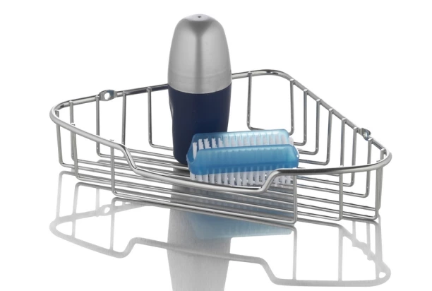 Koupelnová rohová nástěnná police z chromově lesklého kovu poslouží v jakékoliv moderně zařízené koupelně.