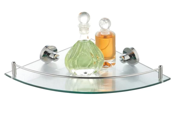 Rohová police z čirého skla nezabere místo a vypadá moderně. Obsahuje i kovové součásti pro zavěšení.