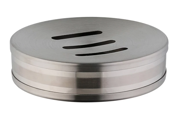 Odkládací miska na mýdlo z kolekce Santo je vyrobena z nerezové oceli a neměla by chybět v žádné koupelně. Miska je ozdobena pruhy a má 3 otvory pro odtok vody.