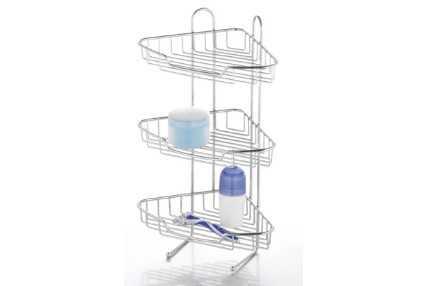 Koupelnový rohový nástěnný regál z chromově lesklého kovu poslouží v jakékoliv moderně zařízené koupelně. Obsahuje celkem 3 přihrádky.