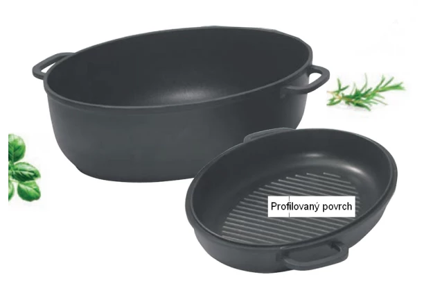 Kvalitní objemný pekáč v oválném tvaru obsahuje praktický poklop, který můžete využít i jako plnohodnotnou pánev na smažení nebo pečení. Vyroben z robustního hliníku s nepřilnavým povrchem. Léty prověřený materiál se postará o několikanásobně rychlejší absorpci tepla, dlouhodobé udržení teploty a snadnou údržbu. Šetří tak energii i čas při vaření.