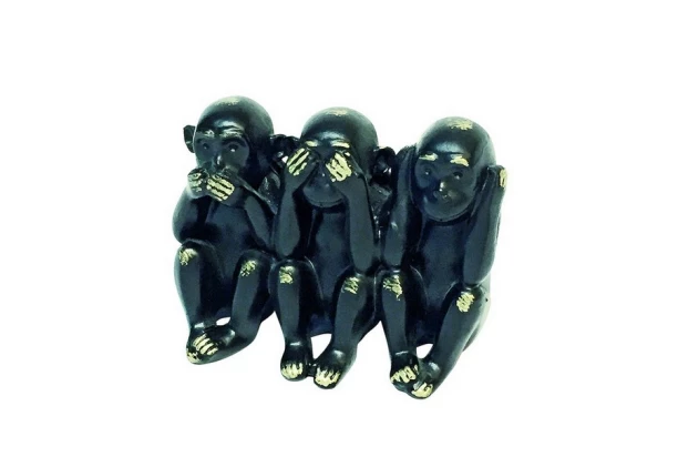 - motiv: 3 sedící opice s gesty (známý motiv legendy o 3 moudrých opicích – znázorňující neslyším zlo/nevidím zlo/nemluvím zlo)