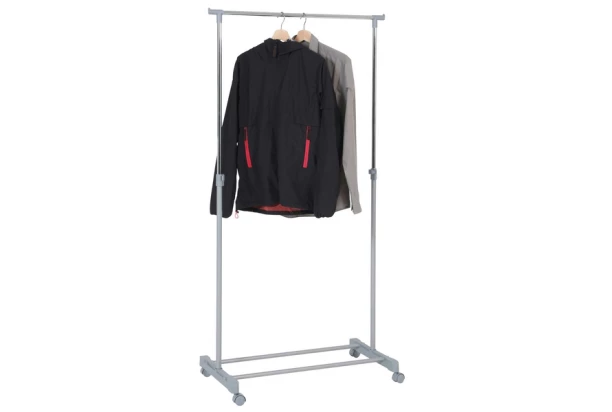 Pojízdný věšák na kolečkách s výškově nastavitelnou konstrukcí.