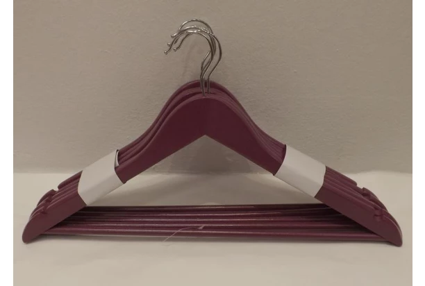 Sada 5 kusů klasických ramínek na oblečení. Dřevěná konstrukce v barvě fialová lila.