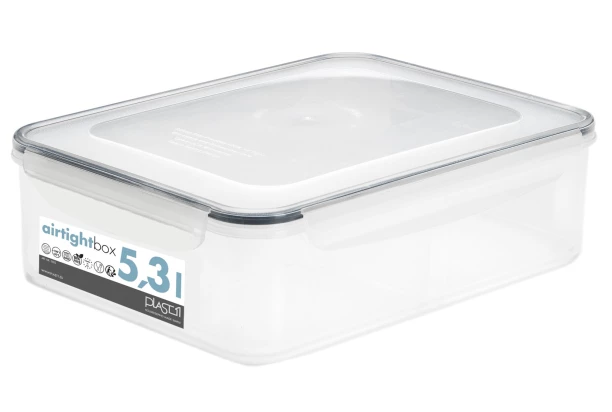 Hranatá plastová dóza na potraviny o vnitřním objemu 5,3 litru je užitečným pomocníkem při uchovávání a přenášení potravin. Vzduchotěsné víko zajistí delší trvanlivost a čerstvost skladovaných potravin.