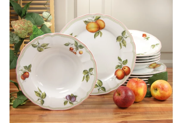 12-dílný jídelní servis s dekorem ovoce v kombinaci s mřížkovaným okrajem skvěle zapadne do venkovského stylu bydlení, ideální také na chalupu. Nádobí je vyrobeno z vysoce kvalitního porcelánu a lze servírovat až pro 6 osob.