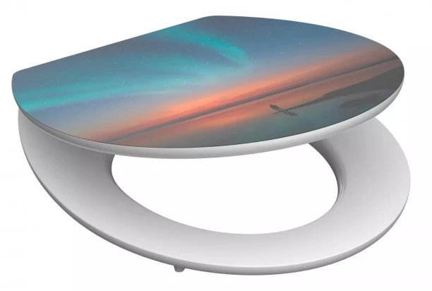 Kvalitní WC prkénko na toaletu z materiálu MDF s motivem polární záře se hodí univerzálně téměř na každou záchodovou mísu. Snadné čištění, hladký a příjemný povrch, tlumené zavírání.