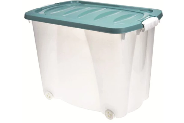 Úložný box o objemu 60 l má zelené víko a praktická kolečka pro snadný přesun. Ideální pro ukládání prádla, doplňků či sezónních věcí.