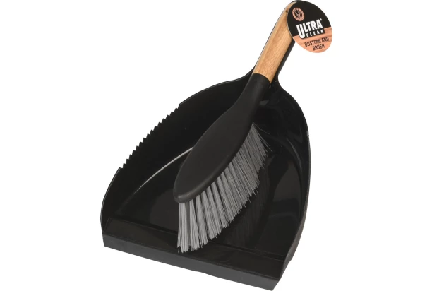 Úklidový set smetáčku s lopatkou v černé barvě. Smetáček má jemné tmavě šedé štětiny s bambusovou rukojetí a je vhodný na zametání jemného prachu.