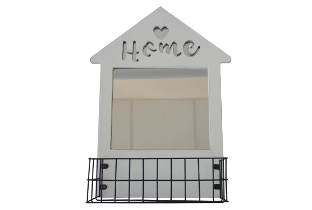 Praktické a hlavně stylové nástěnné zrcadlo ve tvaru domečku s vyříznutým srdíčkem a nápisem Home v bílé barvě dodá Vaší domácnosti útulno. V dolní části se nachází kovový úložný košík, který je ideální na poštu nebo různé drobnosti.