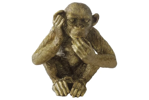 Dekorační soška sedící opice se zakrytým uchem ve zlaté barvě je elegantním bytovým doplňkem.
