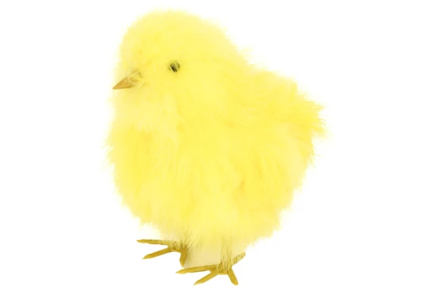 Velké žluté kuřátko z peří s plastovými nožkami a zobáčkem nesmí chybět v žádné velikonoční výzdobě. Dekorace je vysoká 16 cm.
