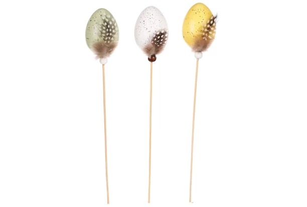 Dekorační zápich (6 ks) pomůže dotvořit velikonoční atmosféru. Plastová vajíčka s pírkem jsou v barvě zelená, bílá a žlutá.