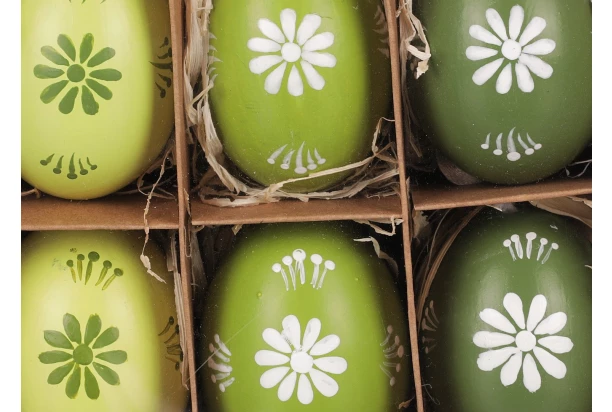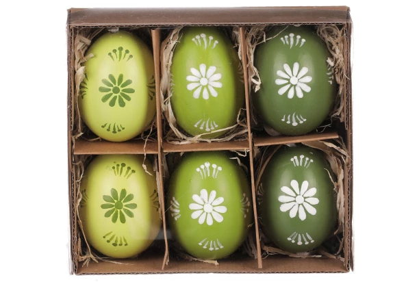 6-dílná sada velikonočních vajíček se stane krásnou dekorací a navodí příjemnou atmosféru. Malované kraslice v zelené variantě jsou ze slepičích vajíček.