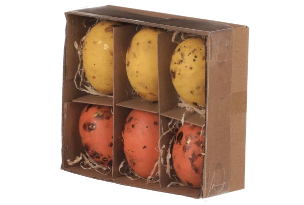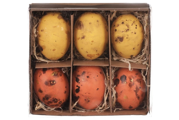 6-dílná sada velikonočních vajíček se stane krásnou dekorací a navodí tu správnou sváteční atmosféru. Vyfouklá slepičí vejce jsou kropenatá, v barvě žlutá a oranžová.