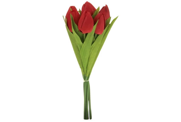 Krásně aranžovaná umělá kytice červených tulipánů. Puget vypadá elegantně, ozdobí každý interiér a není potřeba ani zalévání.