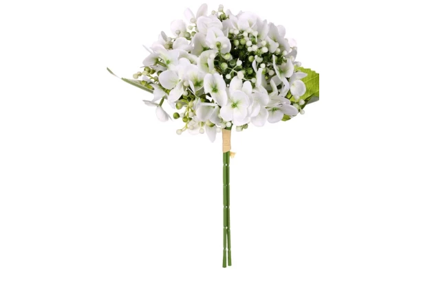 Krásně aranžovaná umělá kytice bílých hortenzií. Puget vypadá elegantně, ozdobí každý interiér a není potřeba ani zalévání.