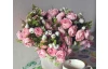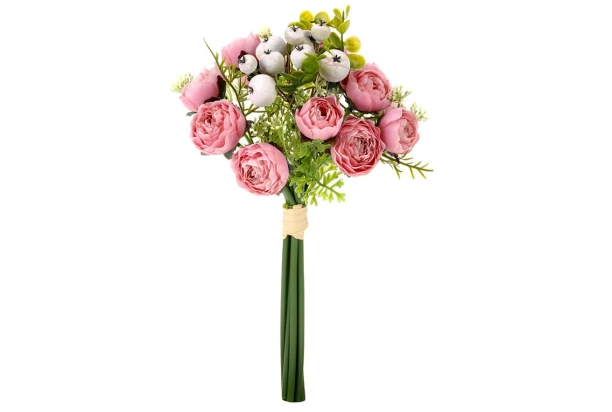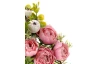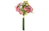 Krásně aranžovaná umělá kytice imituje pryskyřníky v růžové barvě. Pryskyřníky neboli ranunkulusy v pugetu vypadají elegantně a ozdobí každý domov.