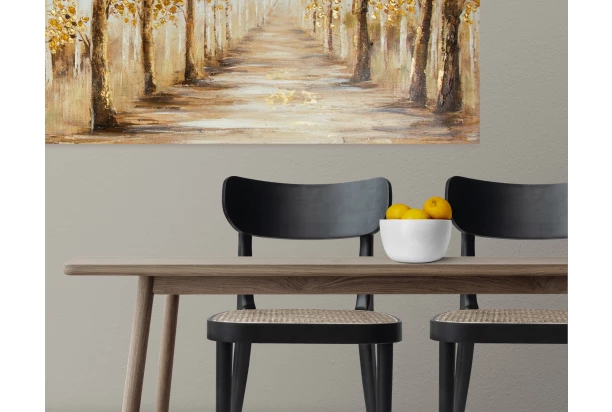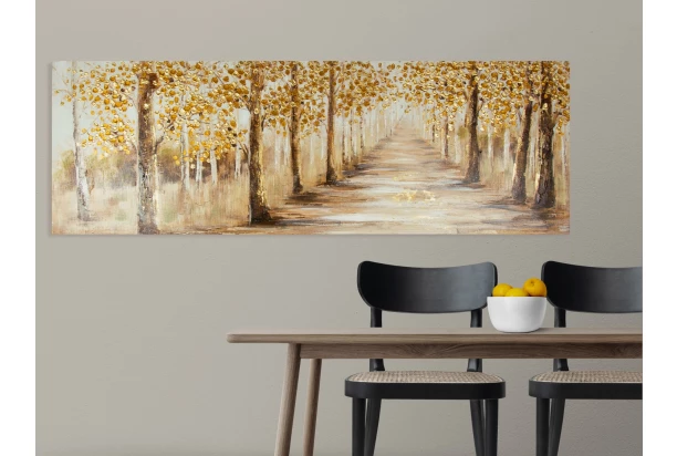 Ručně malovaný obraz na zeď s výraznou strukturou povrchu vytvářející 3D efekt se stane jedinečnou dekorací Vaší domácnosti. Umělecký originál s přírodním motivem podzimní stromové aleje ve zlaté barvě zútulní a rozzáří každý interiér. Rozměr 120×40 cm.