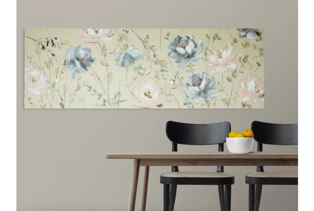 Ručně malovaný obraz na zeď s výraznou strukturou povrchu vytvářející 3D efekt se stane jedinečnou dekorací ve Vaší domácnosti. Umělecký originál malovaný akrylovými barvami s přírodním motivem lučních květin v moderním zpracování zútulní a rozzáří každý interiér. Rozměr 120×40 cm.