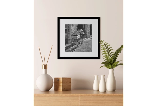 Zarámovaný obraz v dřevěném černém rámu s motivem jízdního kola na ulici je vyroben technikou fototisku. Jednoduché, ale elegantní černobílé provedení obrazu dodá Vašemu interiéru výjimečnou atmosféru. Rozměr 30×30 cm.