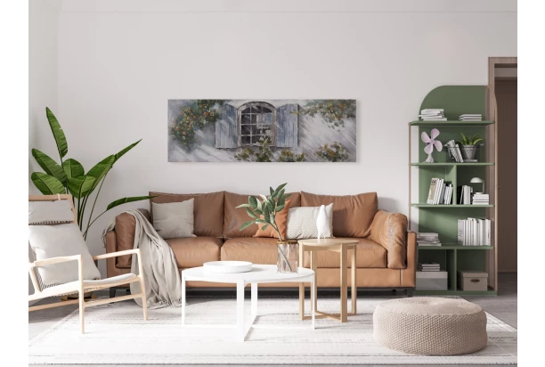 Ručně malovaný obraz na zeď s výraznou strukturou povrchu se stane jedinečnou dekorací ve Vaší domácnosti. Umělecký originál malovaný akrylovými barvami s motivem okenice zútulní a rozzáří každý interiér. Rozměr 150×50 cm.