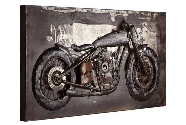 Ručně vyrobený obraz na zeď ve vintage optice na kovovém podkladu vytváří jedinečný 3D efekt. Umělecký obraz s motivem veteránské motorky se stane netradiční dekorací ve Vašem interiéru. Rozměr 60×40 cm.
