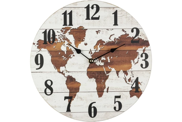 Nástěnné dřevěné hodiny ve stylovém provedení s motivem mapy světa perfektně dotvoří celkový dojem každé místnosti. Průměr 30 cm.