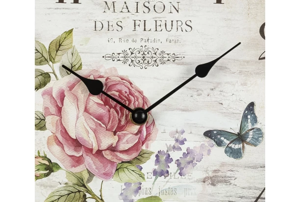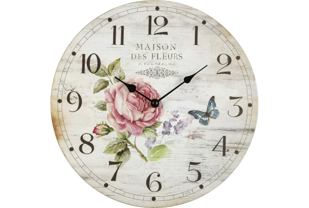Nástěnné dřevěné hodiny Maison des fleurs perfektně dotvoří celkový dojem každé místnosti. Krásný motiv růže s motýlkem dodává hodinám přitažlivý vzhled. Průměr 30 cm.