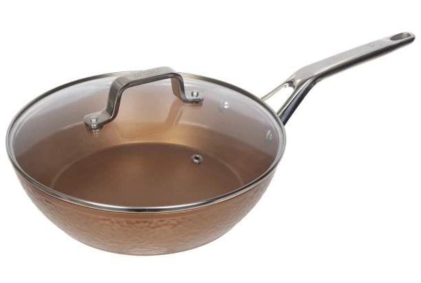 Vysoce kvalitní hluboká pánev s nepřilnavým povrchem vyrobená z kovaného hliníku v měděné barvě díky vysokému okraji (6,9 cm) nabízí dostatek prostoru pro přípravu velkých porcí. Praktická nerezová a tepelně odolná rukojeť usnadňuje používání při vaření. Pánev je dodávána se skleněnou poklicí. Průměr 26 cm.