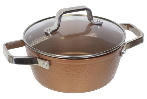 Vysoce kvalitní hrnec o objemu 2,4 l s poklicí a nepřilnavým povrchem vyrobený z kovaného hliníku v měděné barvě je ideální pro každodenní vaření. Průměr 20 cm.
