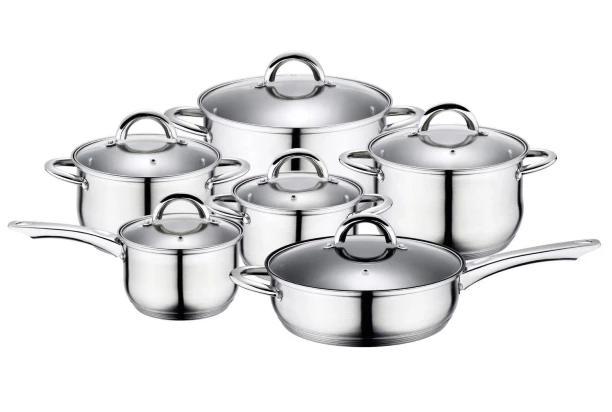 Elegantní sada praktického nádobí na vaření je vyrobena z nerezové oceli a obsahuje celkem 12 dílů. Může být použita se všemi typy sporáků.