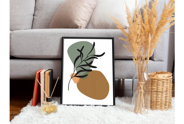 Obraz v dřevěném černém rámu s nádechem skandinávského a boho stylu v podobě minimalistické moderní malby s botanickým listem a abstraktními tvary evokuje pocit pohody a umožní Vám vytvořit útulný domov. Nástěnná umělecká dekorace v příjemných barvách se skvěle hodí jako doplněk do obývacího pokoje, ložnice nebo domácí pracovny. Rozměr 30×40 cm.