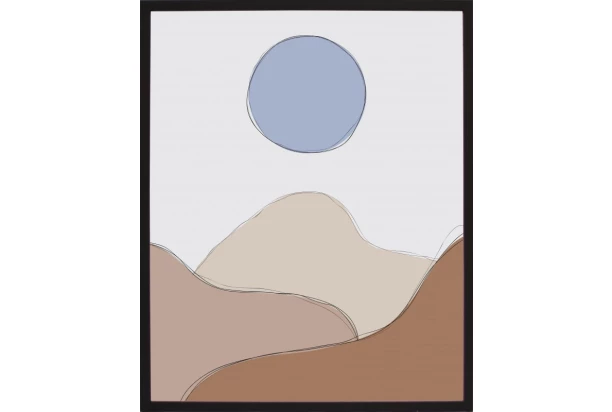 Obraz v dřevěném černém rámu s nádechem skandinávského a boho stylu v podobě minimalistické moderní malby s motivem krajiny a měsíce evokuje pocit pohody a umožní Vám vytvořit útulný domov. Nástěnná umělecká dekorace v příjemných barvách se skvěle hodí jako doplněk do obývacího pokoje, ložnice nebo domácí pracovny. Rozměr 40×50 cm.