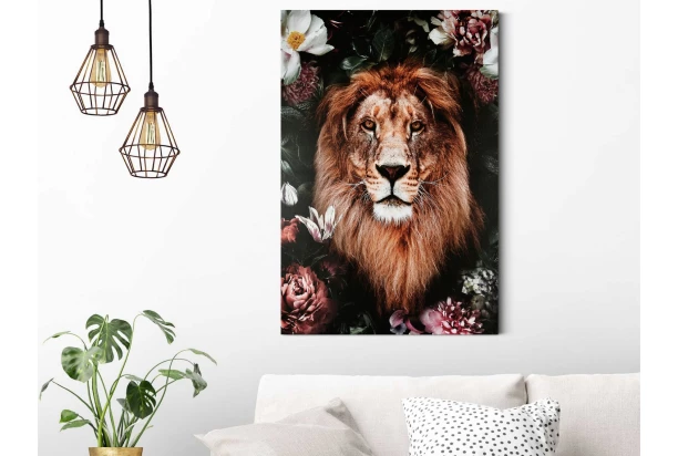 Krásný obraz tištěný na plátně s motivem lva v květinách se stane skutečným poutačem a okamžitě oživí každý interiér. Rozměr 60×80 cm.