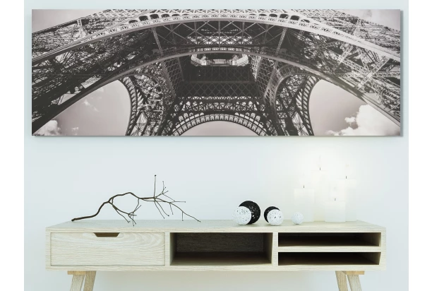 Panoramatický obraz na plátně s motivem detailu architektury Eiffelovy věže v podobě staré fotografie dotvoří jedinečnou atmosféru domova. Rozměr 150×50 cm.