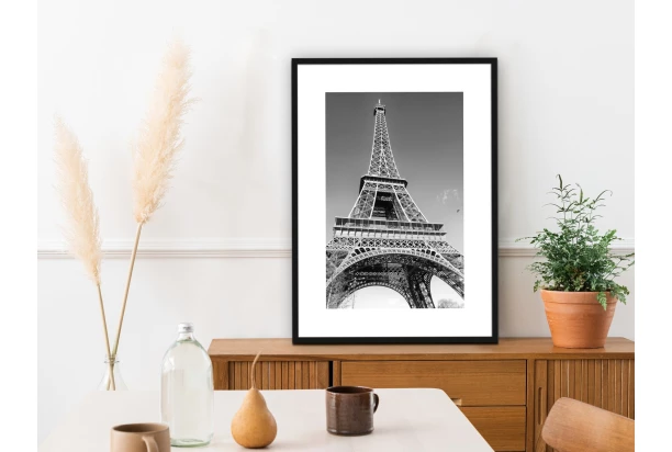 Zarámovaný obraz v dřevěném černém rámu s motivem Eiffelova věž je vyroben technikou fototisku. Jednoduché, ale elegantní černobílé provedení obrazu dodá Vašemu interiéru výjimečnou atmosféru. Rozměr 50×70 cm.