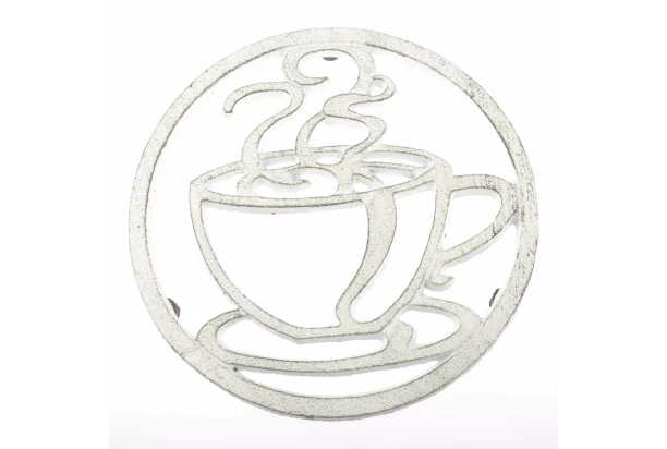 Bílá litinová podložka pod horké nádobí je velmi praktickou součástí každé dnešní domácnosti – ochrání povrchy kuchyně a jídelny před popálením a zároveň znečištěním. Kulatá podložka zdobená šálkem ve vintage optice má průměr 18 cm.